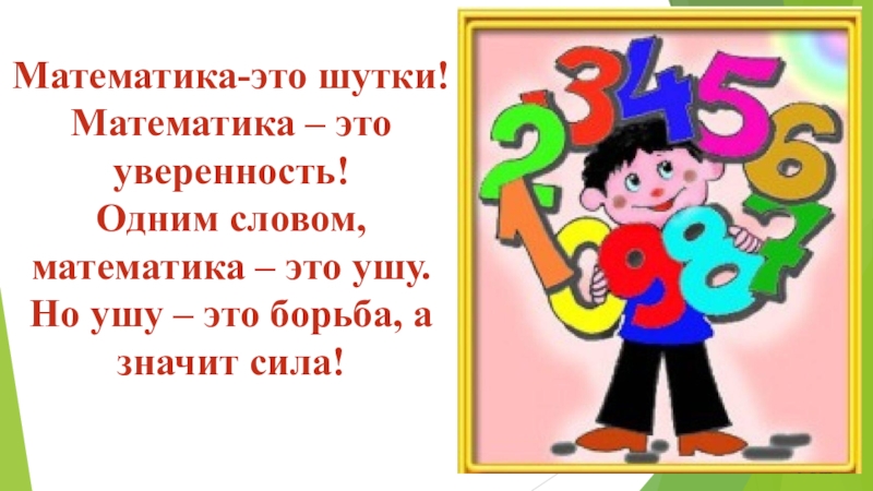Математика-это шутки!Математика – это уверенность!Одним словом, математика – это ушу.Но ушу – это борьба, а значит сила!