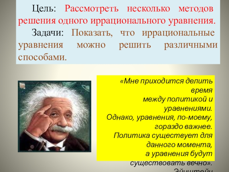 Цель: Рассмотреть несколько методов решения одного иррационального уравнения.