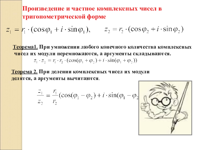 Теорема 2. При делении комплексных чисел их модули делятся, а аргументы вычитаются.