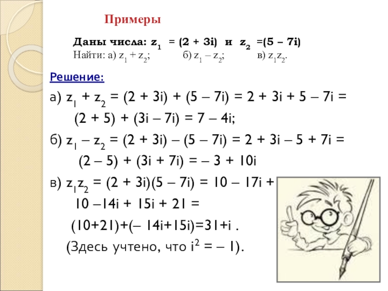 Даны числа: z1 = (2 + 3i) и z2 =(5 – 7i)
