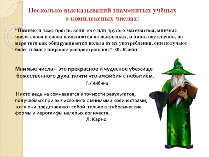 “Помимо и даже против воли того или другого математика, мнимые числа снова и снова появляются на выкладках, и лишь постепенно, по мере того как обнаруживается польза от их употребления, они получают более и более широкое распространение” Ф. Клейн