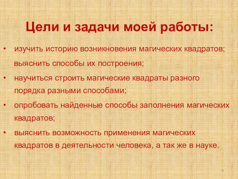 выяснить возможность применения магических квадратов в деятельности человека, а так же в науке.