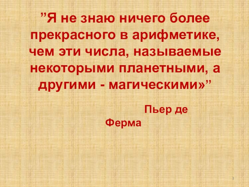 Слайд 3”Я не знаю ничего более прекрасного в арифметике, чем эти числа, называемые