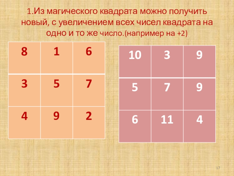 Слайд 171.Из магического квадрата можно получить новый, с увеличением всех чисел квадрата
