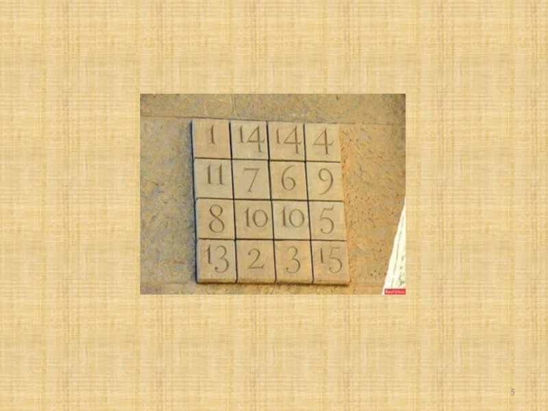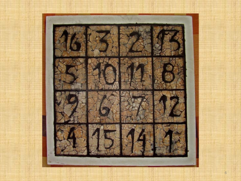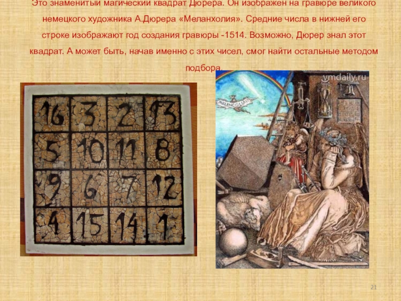 художника А.Дюрера «Меланхолия». Средние числа в нижней его строке изображают год создания гравюры -1514. Возможно, Дюрер знал этот квадрат. А может быть, начав именно с этих чисел, смог найти остальные методом подбора.
