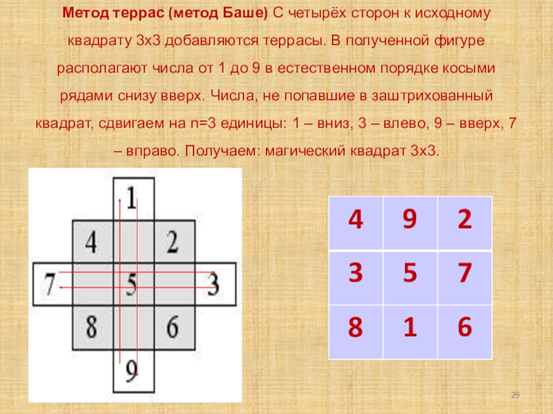 добавляются террасы. В полученной фигуре располагают числа от 1 до 9 в естественном порядке косыми рядами снизу вверх. Числа, не попавшие в заштрихованный квадрат, сдвигаем на n=3 единицы: 1 – вниз, 3 – влево, 9 – вверх, 7 – вправо. Получаем: магический квадрат 3х3.