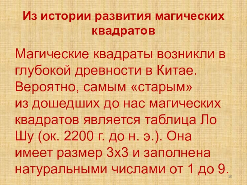 Вероятно, самым «старым» из дошедших до нас магических квадратов является таблица Ло Шу (ок. 2200 г. до н. э.). Она имеет размер 3x3 и заполнена натуральными числами от 1 до 9.