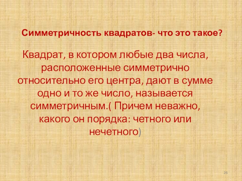 симметрично относительно его центра, дают в сумме одно и то же число, называется симметричным.( Причем неважно, какого он порядка: четного или нечетного)