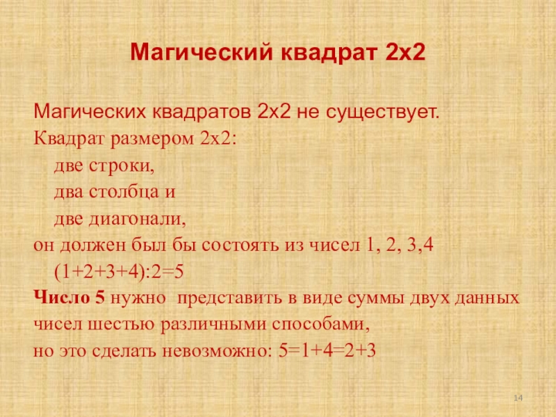 Слайд 19 В магическом квадрате 4х4 сумма чисел по каждой строке, каждому
