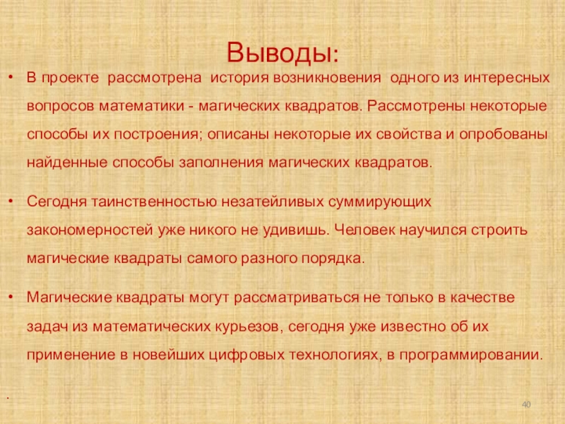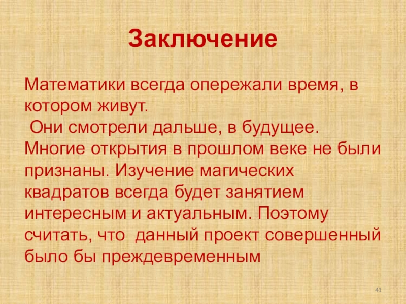 будущее. Многие открытия в прошлом веке не были признаны. Изучение магических квадратов всегда будет занятием интересным и актуальным. Поэтому считать, что данный проект совершенный было бы преждевременным