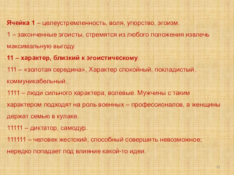 Слайд 32Ячейка 1 – целеустремленность, воля, упорство, эгоизм.