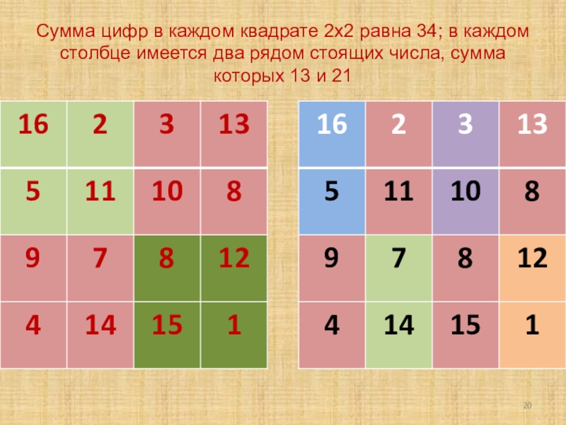 Слайд 20Сумма цифр в каждом квадрате 2х2 равна 34; в каждом столбце