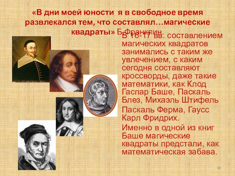 В 16-17 вв. составлением магических квадратов занимались с таким же увлечением, с каким сегодня составляют кроссворды, даже такие математики, как Клод Гаспар Баше, Паскаль Блез, Михаэль Штифель