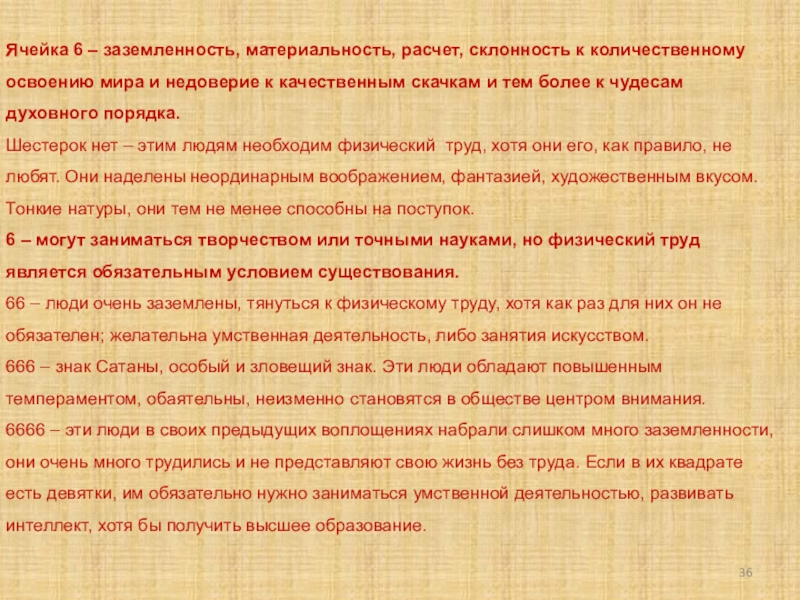 Слайд 36Ячейка 6 – заземленность, материальность, расчет, склонность к количественному освоению мира