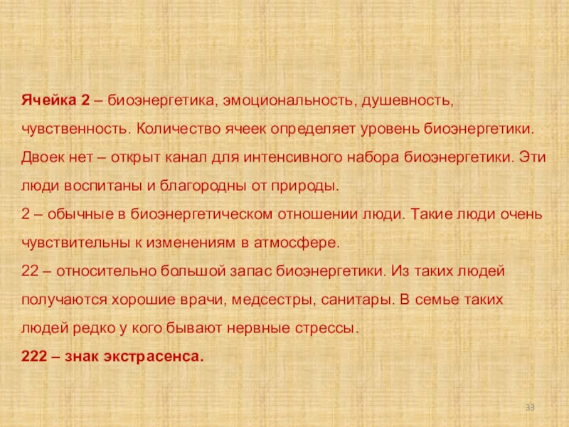 Слайд 33Ячейка 2 – биоэнергетика, эмоциональность, душевность, чувственность. Количество ячеек определяет уровень