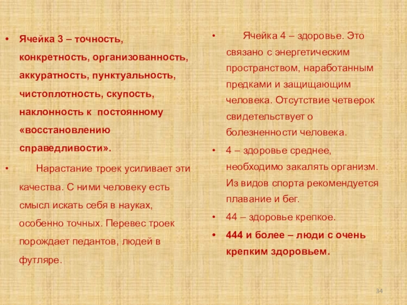 Ячейка 4 – здоровье. Это связано с энергетическим пространством, наработанным предками и защищающим человека. Отсутствие четверок свидетельствует о болезненности человека.