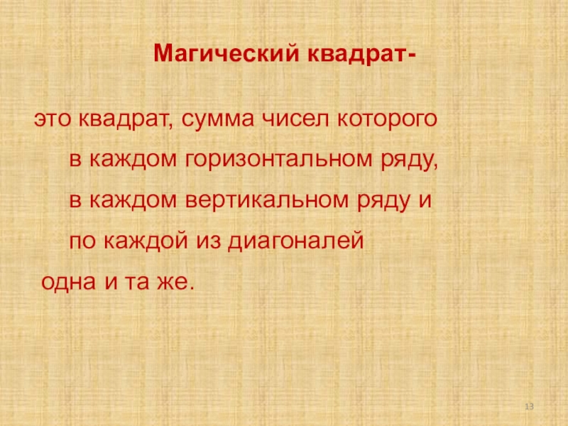 Слайд 25Рассмотрим свойства магического квадрата 5х5, имеющий в центре число 13: