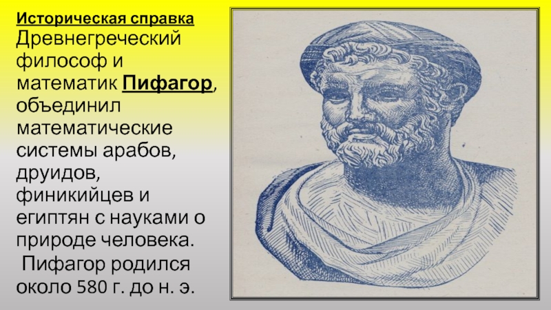 Историческая справка Древнегреческий философ и математик Пифагор, объединил математические системы арабов, друидов, финикийцев и египтян с науками