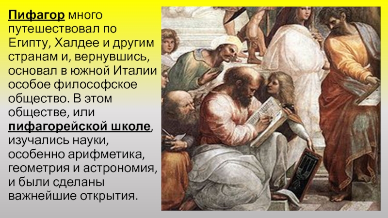 Пифагор много путешествовал по Египту, Халдее и другим странам и, вернувшись, основал в южной Италии особое философское