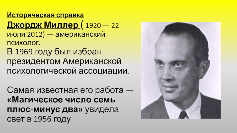 Историческая справка Джордж Миллер ( 1920 — 22 июля 2012) — американский психолог. В 1969 году был