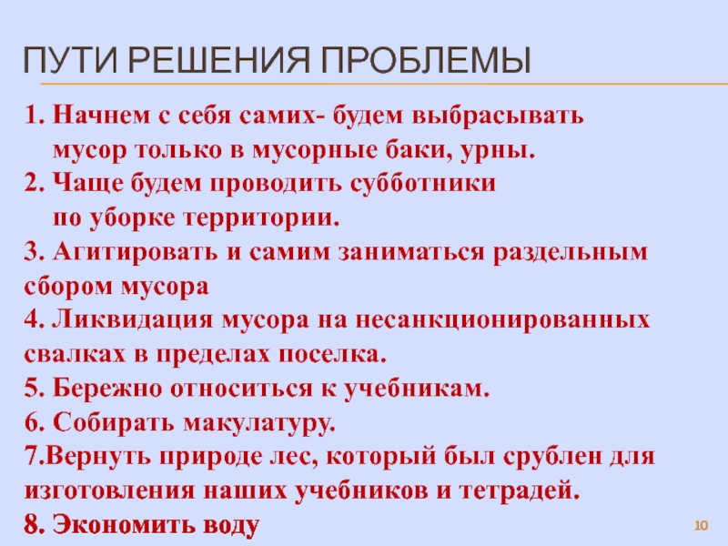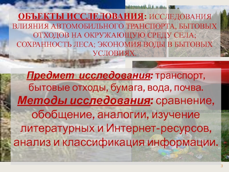 Предмет исследования: транспорт, бытовые отходы, бумага, вода, почва.