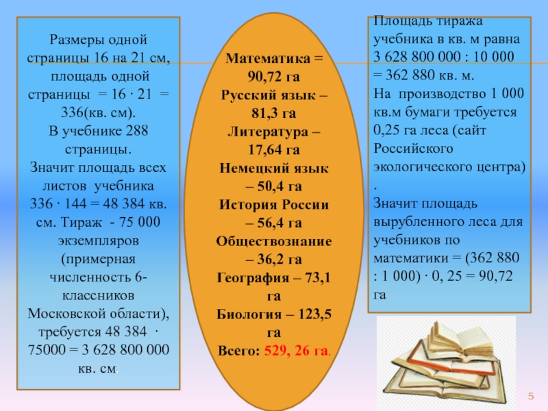 Значит площадь вырубленного леса для учебников по математики = (362 880 : 1 000) ∙ 0, 25 = 90,72 га