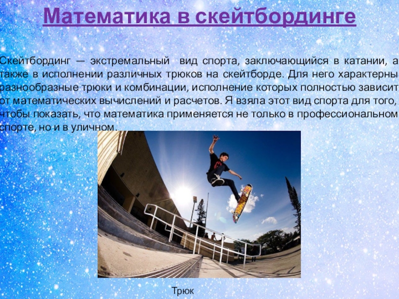 также в исполнении различных трюков на скейтборде. Для него характерны разнообразные трюки и комбинации, исполнение которых полностью зависит от математических вычислений и расчетов. Я взяла этот вид спорта для того, чтобы показать, что математика применяется не только в профессиональном спорте, но и в уличном.