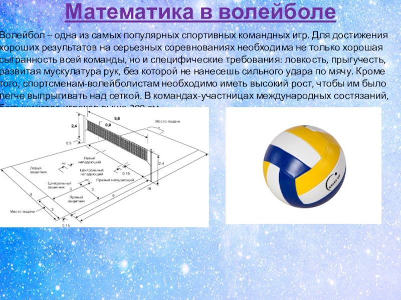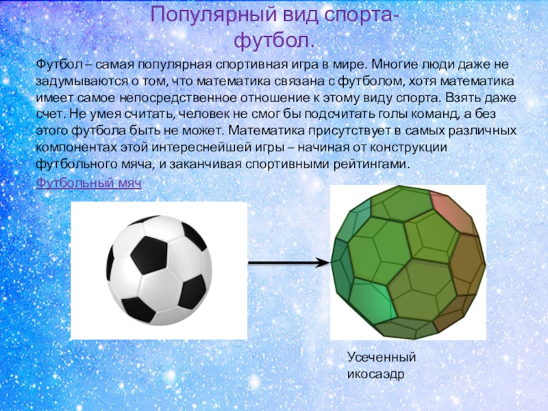 люди даже не задумываются о том, что математика связана с футболом, хотя математика имеет самое непосредственное отношение к этому виду спорта. Взять даже счет. Не умея считать, человек не смог бы подсчитать голы команд, а без этого футбола быть не может. Математика присутствует в самых различных компонентах этой интереснейшей игры – начиная от конструкции футбольного мяча, и заканчивая спортивными рейтингами.