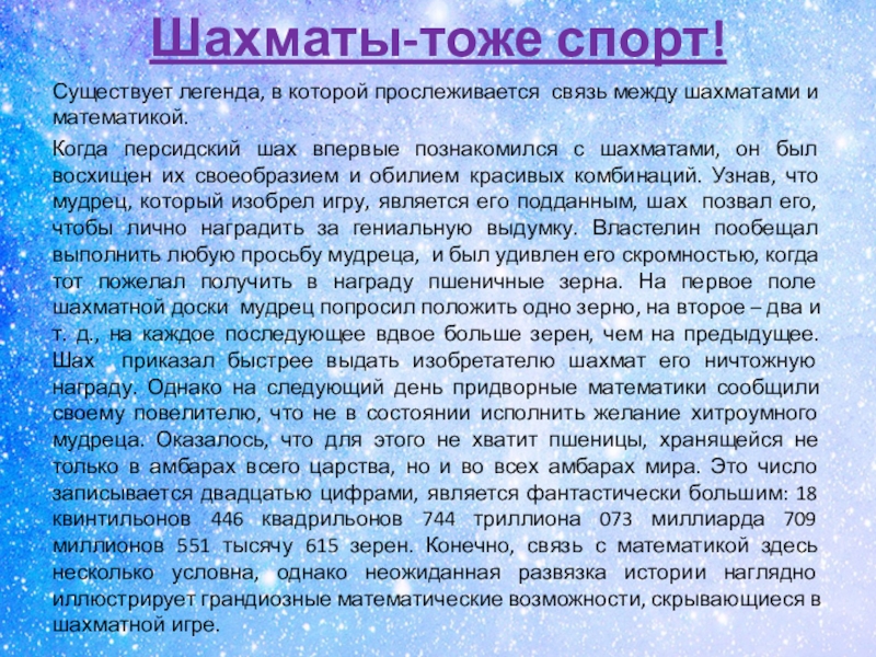 персидский шах впервые познакомился с шахматами, он был восхищен их своеобразием и обилием красивых комбинаций. Узнав, что мудрец, который изобрел игру, является его подданным, шах позвал его, чтобы лично наградить за гениальную выдумку. Властелин пообещал выполнить любую просьбу мудреца, и был удивлен его скромностью, когда тот пожелал получить в награду пшеничные зерна. На первое поле шахматной доски мудрец попросил положить одно зерно, на второе – два и т. д., на каждое последующее вдвое больше зерен, чем на предыдущее. Шах приказал быстрее выдать изобретателю шахмат его ничтожную награду. Однако на следующий день придворные математики сообщили своему повелителю, что не в состоянии исполнить желание хитроумного мудреца. Оказалось, что для этого не хватит пшеницы, хранящейся не только в амбарах всего царства, но и во всех амбарах мира. Это число записывается двадцатью цифрами, является фантастически большим: 18 квинтильонов 446 квадрильонов 744 триллиона 073 миллиарда 709 миллионов 551 тысячу 615 зерен. Конечно, связь с математикой здесь несколько условна, однако неожиданная развязка истории наглядно иллюстрирует грандиозные математические возможности, скрывающиеся в шахматной игре.