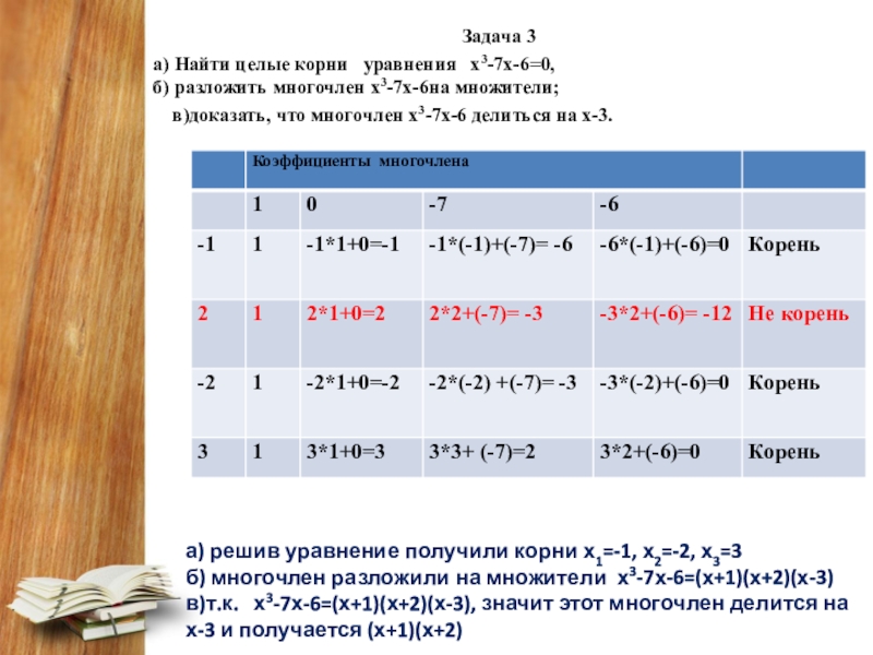 б) многочлен разложили на множители х3-7х-6=(х+1)(х+2)(х-3)