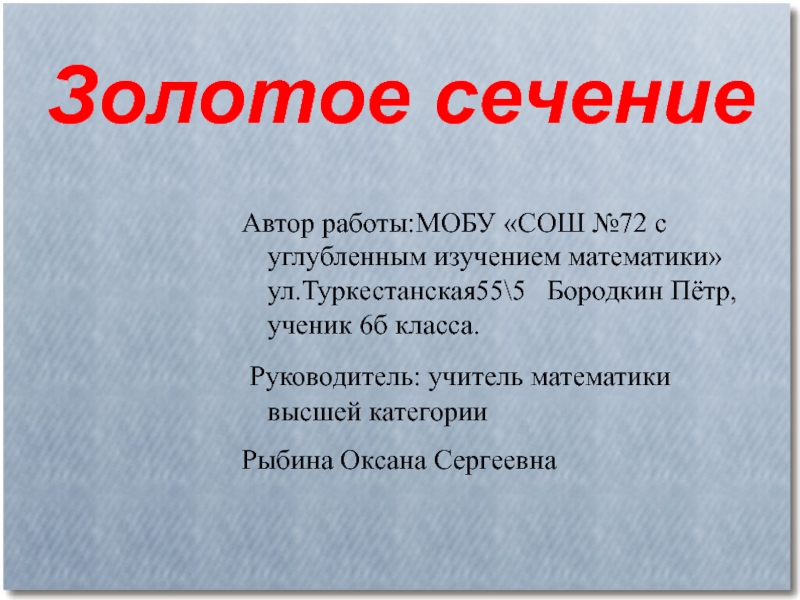 Автор работы:МОБУ «СОШ №72 с углубленным изучением математики» ул.Туркестанская55\5 Бородкин Пётр,ученик 6б класса.