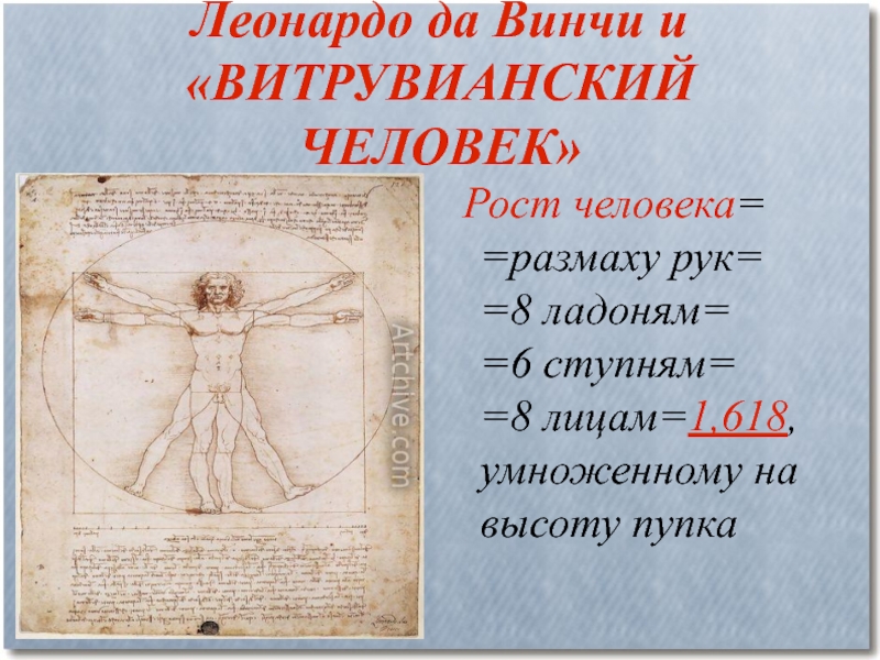 Рост человека= =размаху рук= =8 ладоням= =6 ступням= =8 лицам=1,618, умноженному на высоту пупка