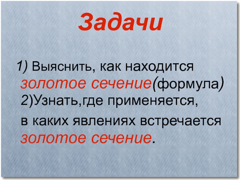 Понять,что такое золотое сечение Узнать,почему это число волно- вало великих математиков и других учёных на протяжении многих веков.