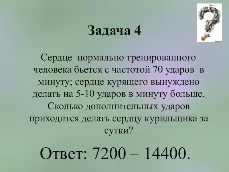 ударов в минуту; сердце курящего вынуждено делать на 5-10 ударов в минуту больше. Сколько дополнительных ударов приходится делать сердцу курильщика за сутки?