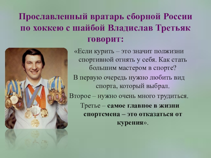 Слайд 26Прославленный вратарь сборной России по хоккею с шайбой Владислав Третьяк говорит: