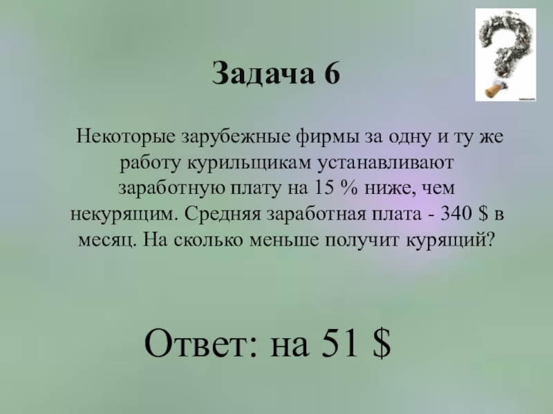 же работу курильщикам устанавливают заработную плату на 15 % ниже, чем некурящим. Средняя заработная плата - 340 $ в месяц. На сколько меньше получит курящий?
