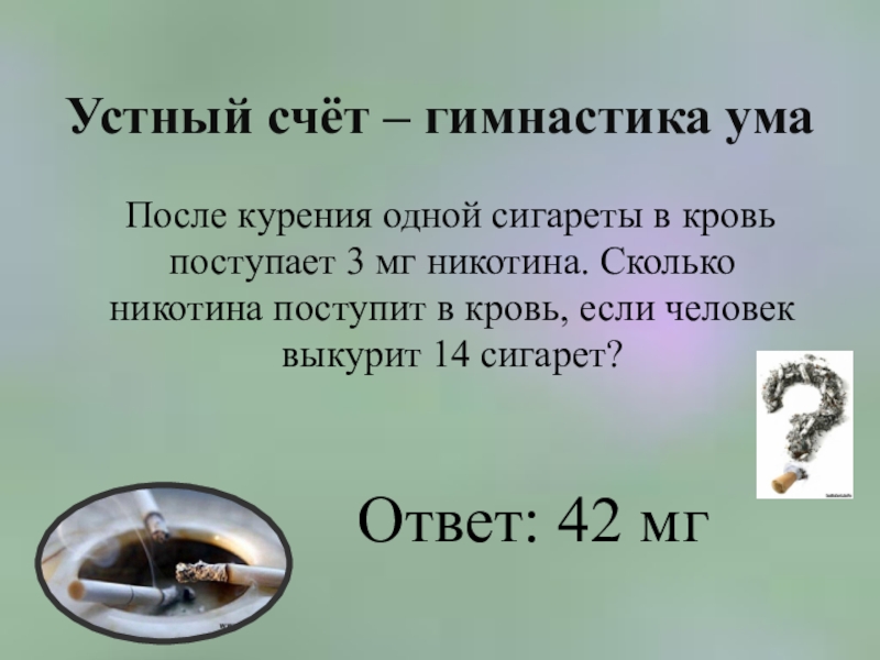 кровь поступает 3 мг никотина. Сколько никотина поступит в кровь, если человек выкурит 14 сигарет?