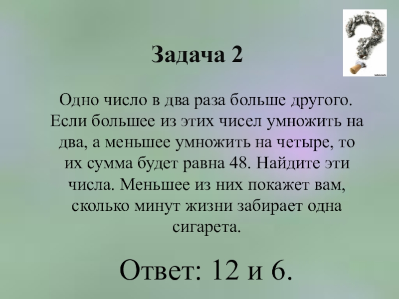 большее из этих чисел умножить на два, а меньшее умножить на четыре, то их сумма будет равна 48. Найдите эти числа. Меньшее из них покажет вам, сколько минут жизни забирает одна сигарета.