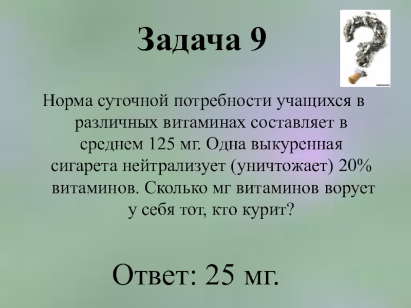 125 мг. Одна выкуренная сигарета нейтрализует (уничтожает) 20% витаминов. Сколько мг витаминов ворует у себя тот, кто курит?