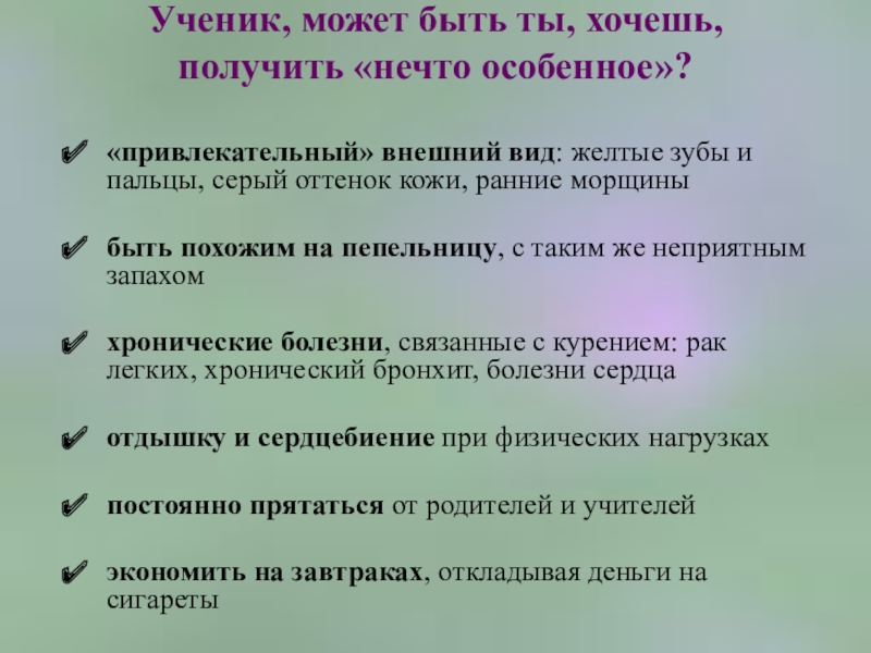 что вас не коснутся отрицательные последствия от курения! Вы не исключения и живёте, как и все организмы, по законам природы. Каждая сигарета отгрызает кусок от отмеренного вам отрезка жизни, стоит ли продолжать?