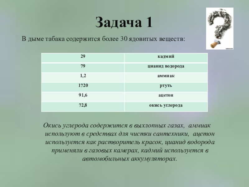 содержится в выхлопных газах, аммиак используют в средствах для чистки сантехники, ацетон используется как растворитель красок, цианид водорода применяли в газовых камерах, кадмий используется в автомобильных аккумуляторах.