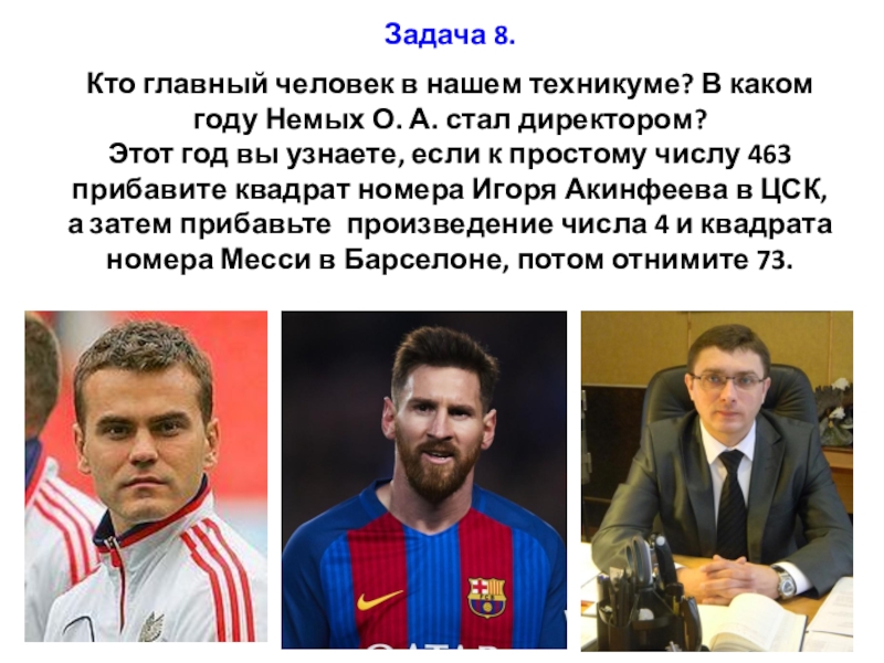 О. А. стал директором? Этот год вы узнаете, если к простому числу 463 прибавите квадрат номера Игоря Акинфеева в ЦСК, а затем прибавьте произведение числа 4 и квадрата номера Месси в Барселоне, потом отнимите 73.