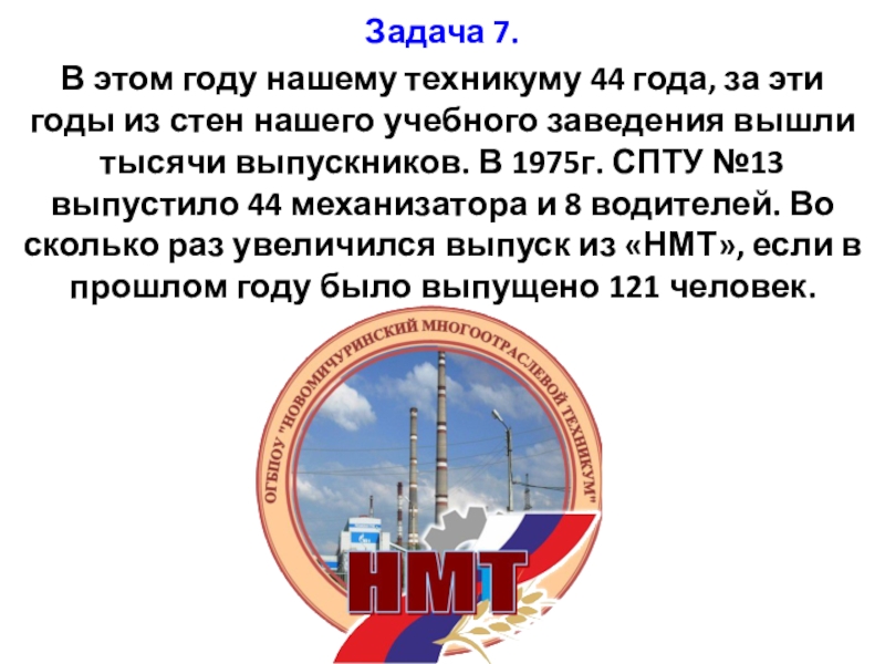 Слайд 11Задача 7.   В этом году нашему техникуму 44 года, за эти годы