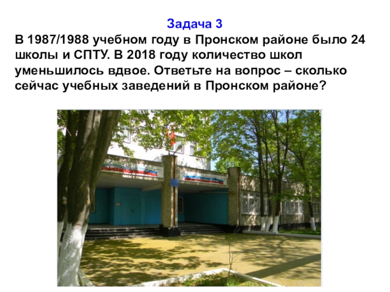 Задача 3В 1987/1988 учебном году в Пронском районе было 24 школы и СПТУ. В 2018 году количество