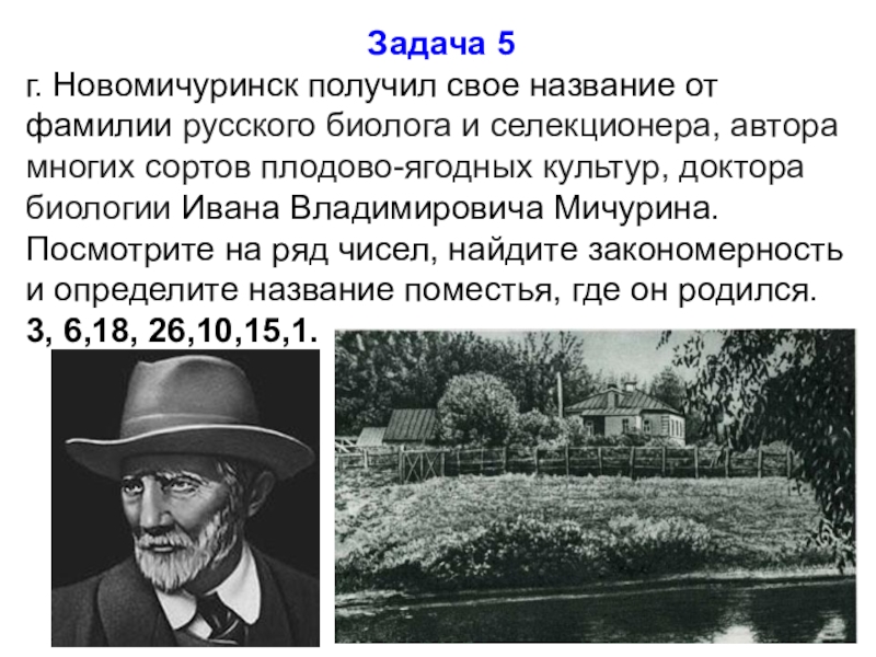 Задача 5г. Новомичуринск получил свое название от  фамилии русского биолога и селекционера, автора многих сортов плодово-ягодных