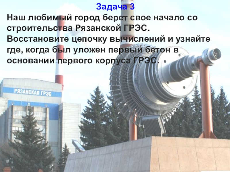 Задача 3Наш любимый город берет свое начало со строительства Рязанской ГРЭС.Восстановите цепочку вычислений и узнайте где, когда