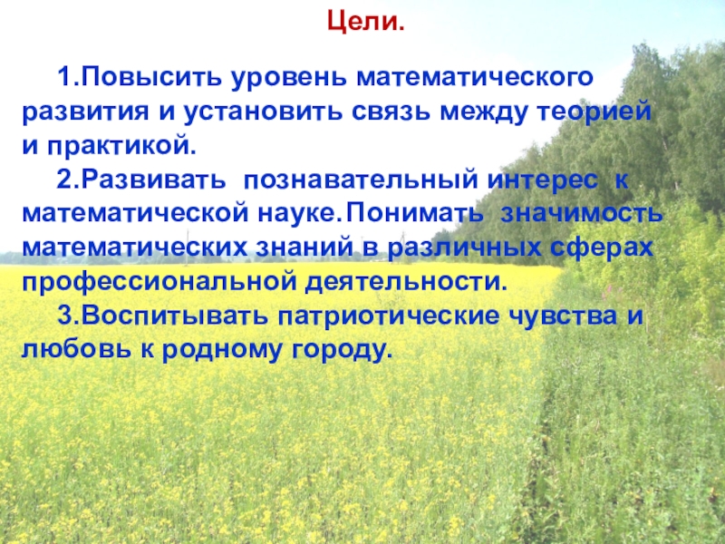 Цели. 1.Повысить уровень математического развития и установить связь между теорией и практикой.2.Развивать познавательный интерес к математической науке. Понимать значимость математических знаний в различных сферах профессиональной деятельности.3.Воспитывать патриотические чувства и любовь к родному городу.
