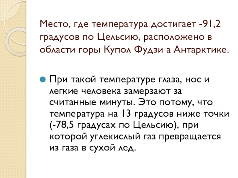 При такой температуре глаза, нос и легкие человека замерзают за считанные минуты. Это потому, что температура на 13 градусов ниже точки (-78,5 градусах по Цельсию), при которой углекислый газ превращается из газа в сухой лед.