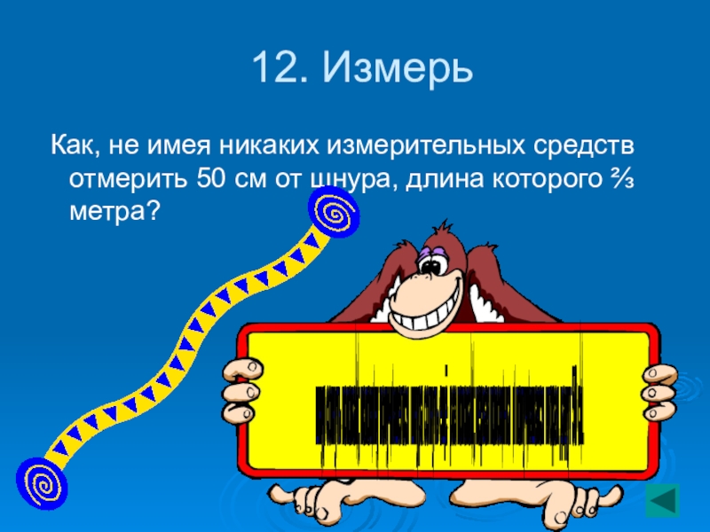 12. Измерь Как, не имея никаких измерительных средств отмерить 50 см от шнура, длина которого ⅔ метра?шнур