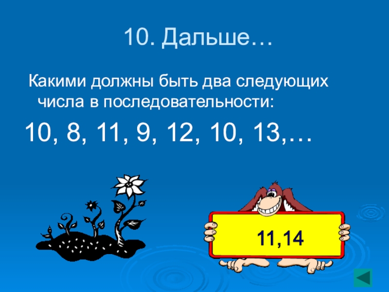 10. Дальше… Какими должны быть два следующих числа в последовательности:10, 8, 11, 9, 12, 10, 13,…11,14
